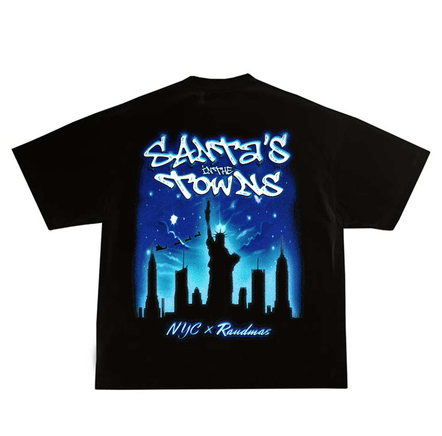 Limited Edition Santa’s In The Towns Tee, a holiday collectible inspired by NYC nights and Raudmas spirit. Featuring a bold airbrushed skyline graphic and custom lettering, this premium tee is designed for both comfort and statement looks. Rep the community during the most iconic Raudmas yet. Only available for a limited time.